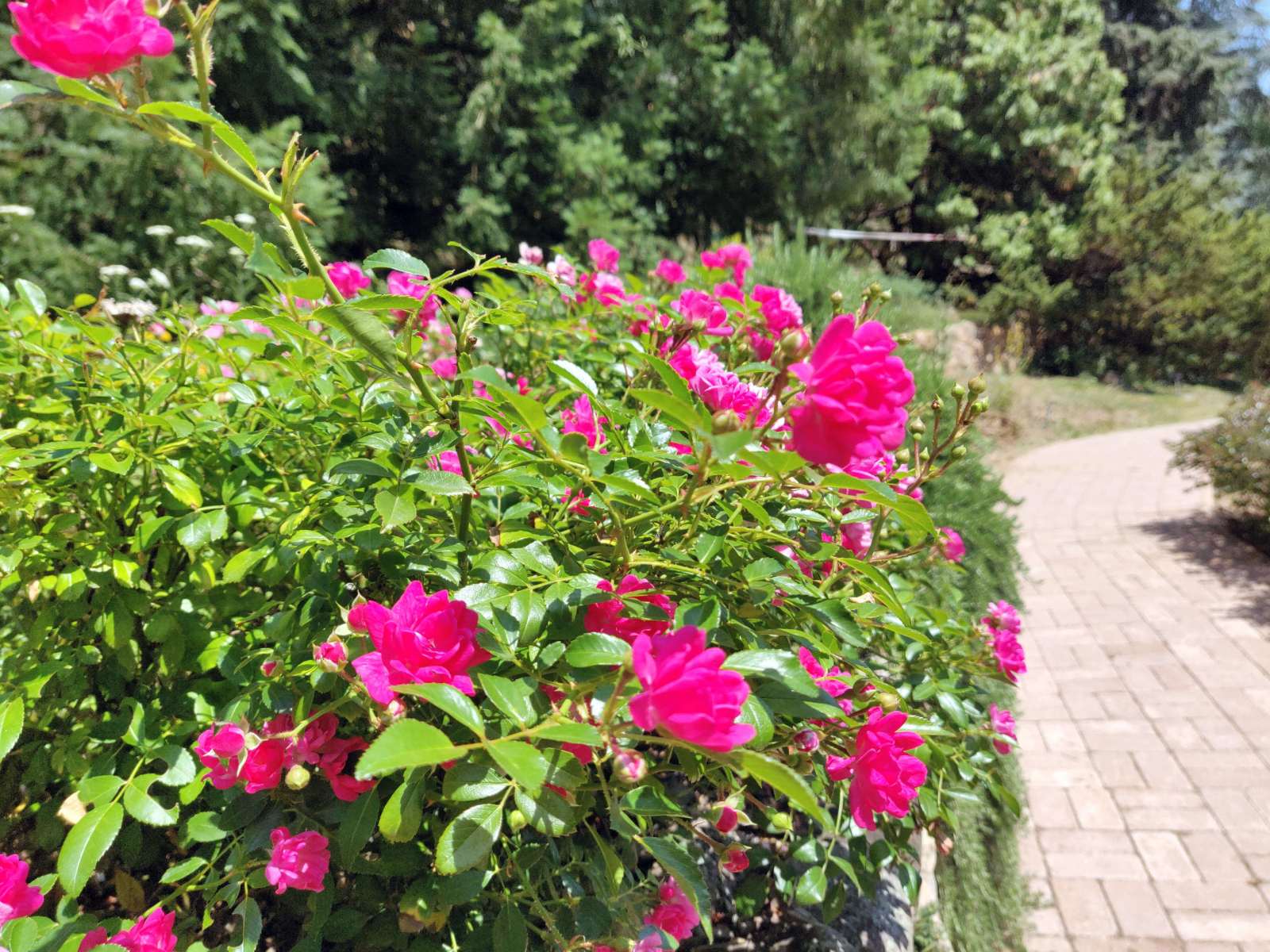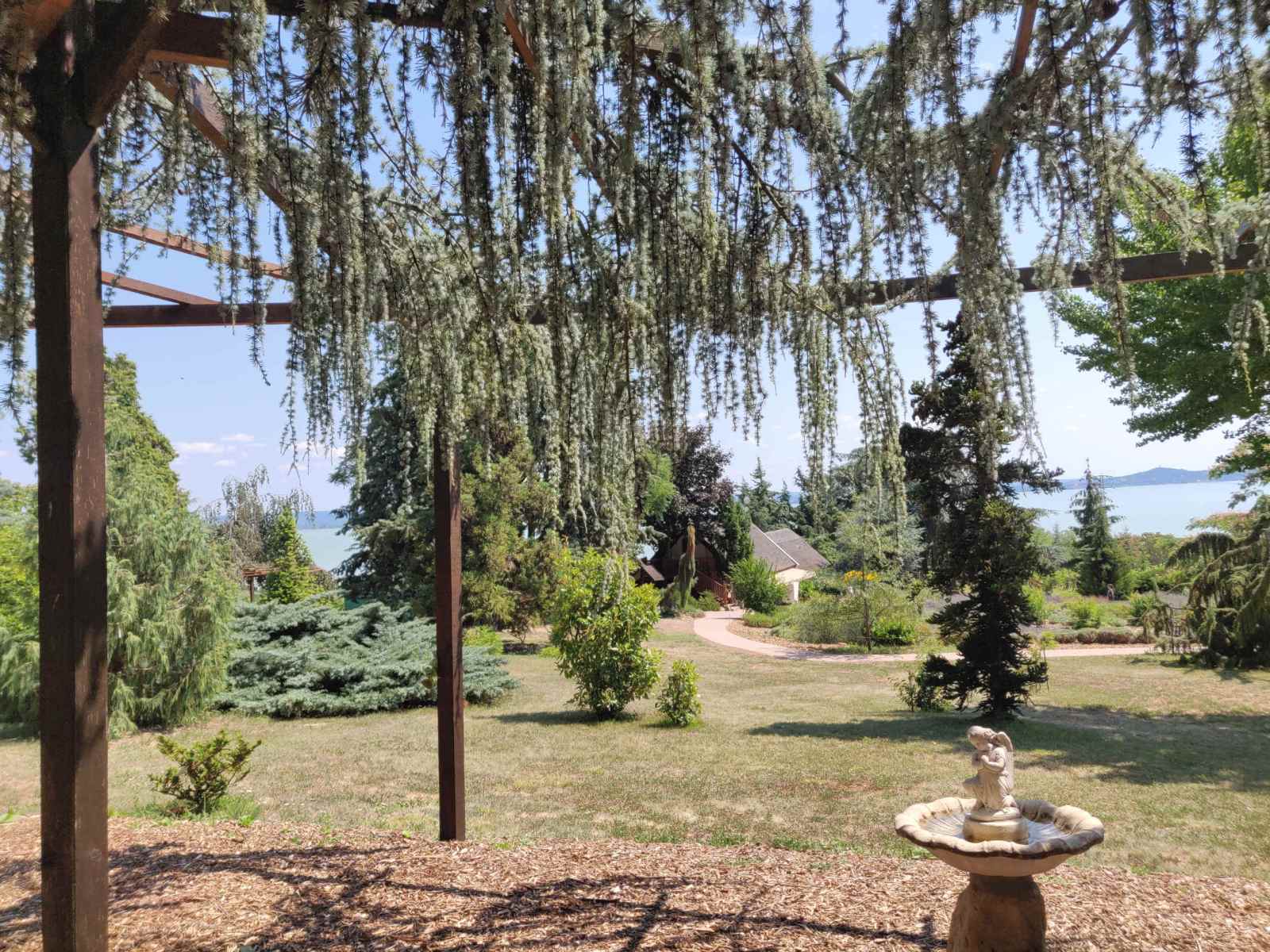 Méretes pergolák alatt pihenhetünk meg sétánk közben, ám a stabil fadeszkákon nem szőlő vagy futórózsa díszlik, hanem szomorú bükk és cédrus zöld lombja nyújt kellemes árnyékot.