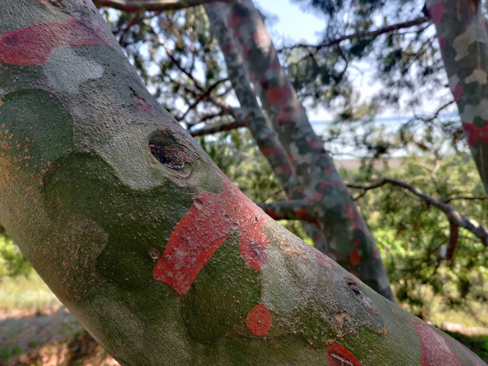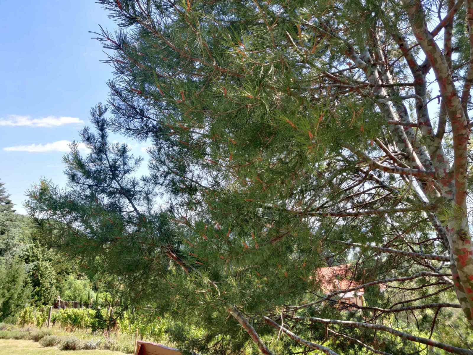 A sok különleges tűlevelű között kedvencem a platánkérgű diófenyő, minden alkalommal megnézem egészen meghökkentően színes kérgét, amelyet mintha egy gyerek festett volna foltosra piros és világosszürke temperájával. Idén a cserjék között találtam olyat, amely valahogy eddig elkerülte a figyelmemet, mégpedig a táskacserjét, melynek igazán figyelemfelkeltő világoskék virágfürtje érdekes színfolt a nyárvégi kertben.